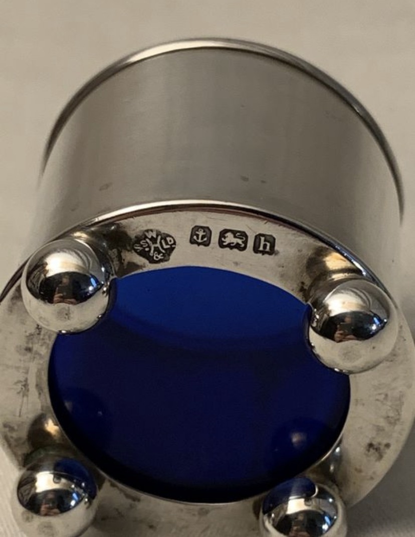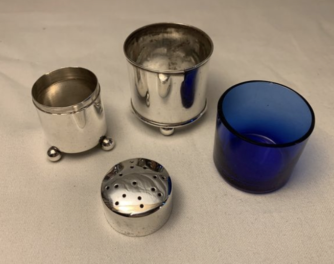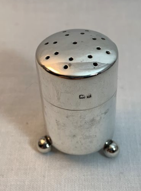 Binnenkort in de Constcamer: een zilveren strooier en zoutbakje uit Birmingham, Engeland. De zilvermerken zijn duidelijk te zien. Het bakje (4 cm hoog) is gemerkt met de jaarletter H van 1907 en het meesterteken A BROS LTD van Adie Brothers Ltd; een van hun vroege werken. De strooier (4,5 cm) heeft de I van 1908 en het meesterteken William Hutton & Sons Ltd.. De strooier is in perfecte staat en het bakje, waarin een fraai blauw glazen kommetje steekt, vertoont een scheurtje.